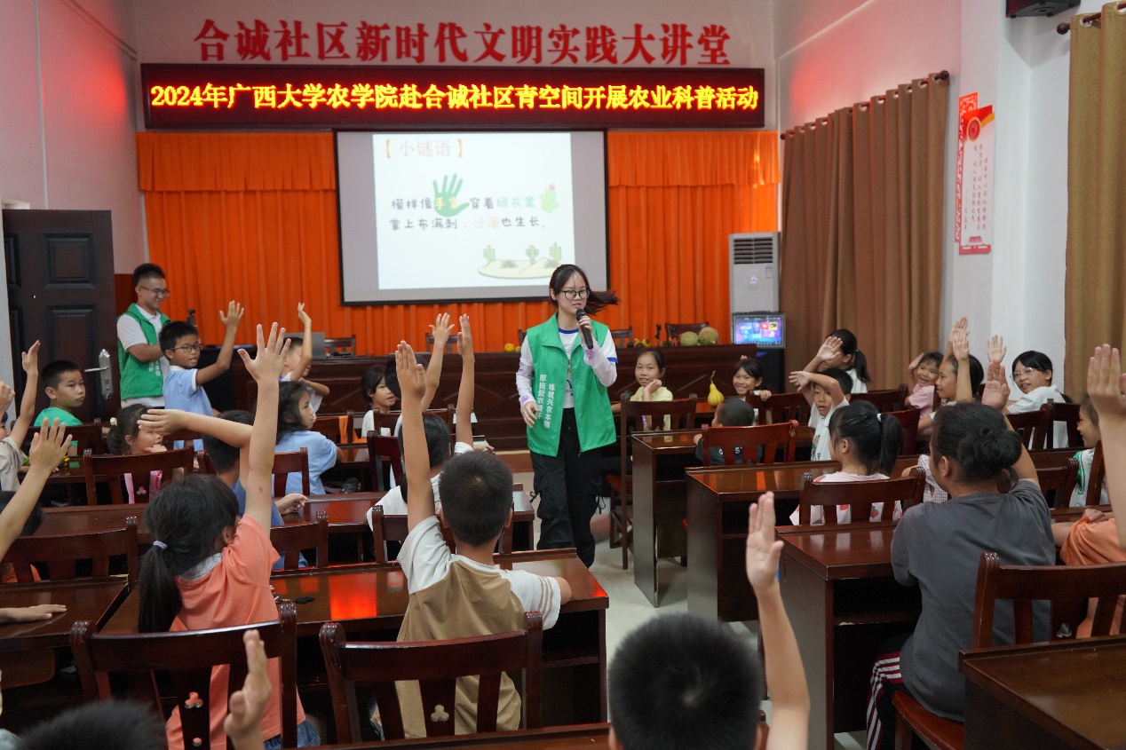 威尼斯432888cam学生乡村振兴学社来到马山县合诚社区青空间为社区的孩子们上了一堂科普教育课,通过丰富多彩的形式展开,核心内容聚焦于红色文化的传承、农业知识的普及,进一步拓展了学生的视野,引导他们对农业科学有了更浓厚的兴趣。