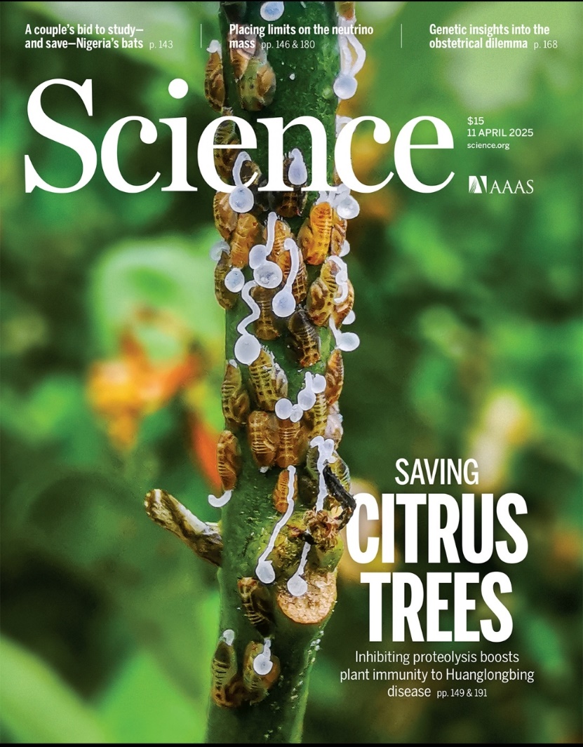 2025年4月11日,中国科学院微生物研究所叶健研究员团队在《Science》杂志以封面文章形式在线发表题为Targeted MYC2 stabilization confers citrus Huanglongbing resistance的研究成果。该研究首次系统性解析了柑橘应对黄龙病(Huanglongbing, HLB)的核心分子机制,揭示了由E3泛素连接酶PUB21与转录因子MYC2构成的抗性遗传调控网络。基于机制解析,该团队通过人工智能辅助筛选技术鉴定出双功能肽APP3-14,该小肽可特异性稳定MYC2蛋白并阻断其泛素化降解。田间验证显示,APP3-14能显著抑制黄龙病病原菌扩散,单季防控效率达80%,且对柑橘植株生长无不良影响。这一发现阐明了植物-病原互作的新模式。值得注意的是,该研究中小肽APP3-14的研发及其田间应用为黄龙病的绿色防控提供了创新性解决方案,不仅丰富了现有的防控手段,还为以小肽为核心的新一代绿色农药研发注入了强劲动力,有望加速相关领域的技术突破与产业化进程。