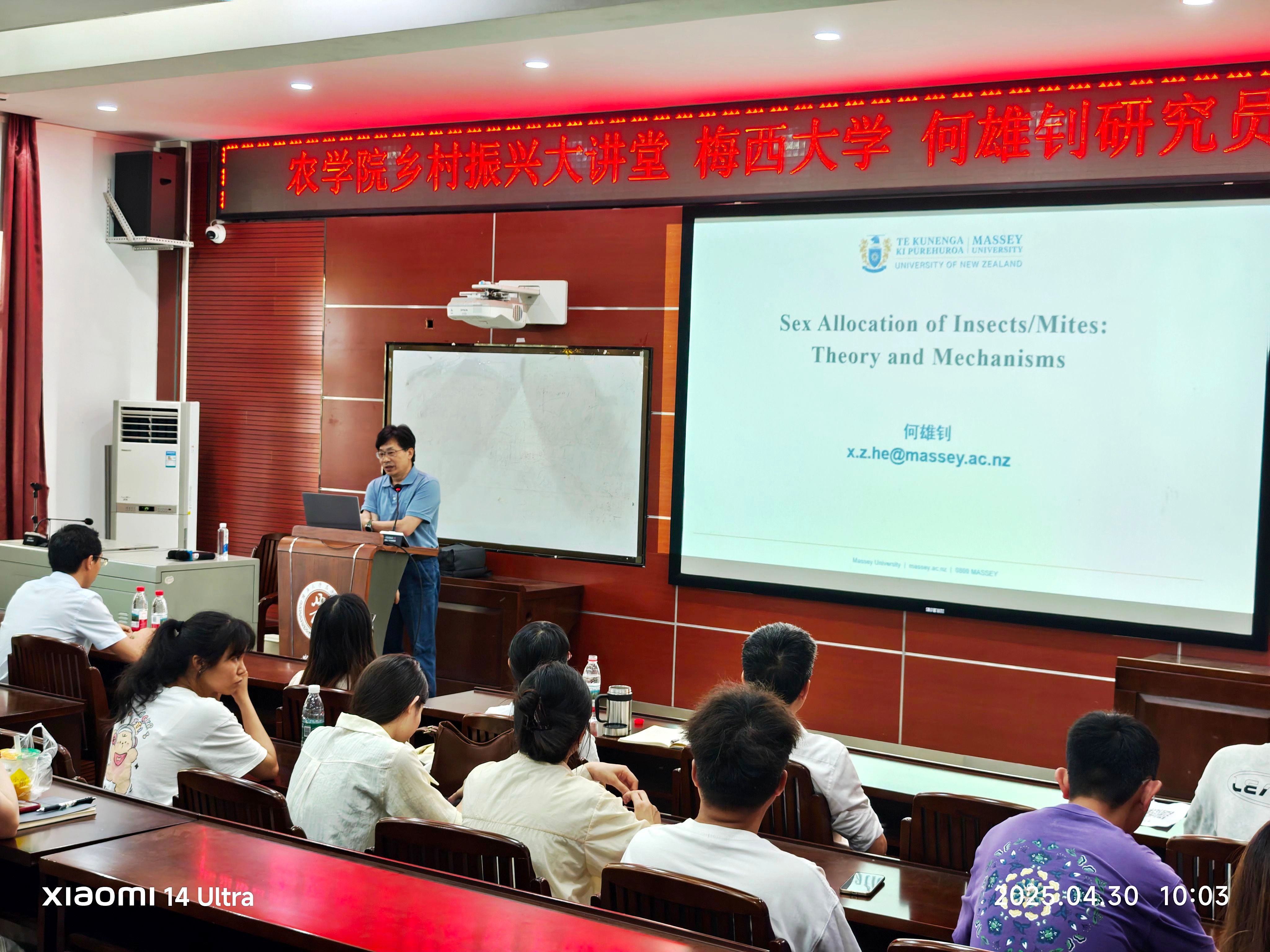 4月30日,由威尼斯官网主办的“乡村振兴大讲堂”学术活动在学院306多媒体学术报告厅举办。新西兰梅西大学何雄钊研究员应邀以“Sex Allocation of Insects/Mites: Theories and Mechanisms”为题,为威尼斯官网师生带来了一场精彩的学术报告,报告会由郑霞林教授主持。