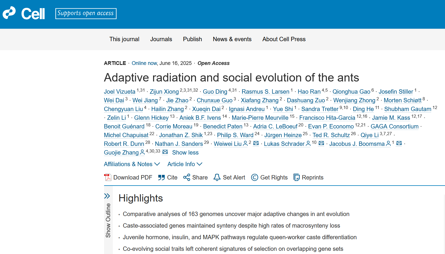 2025年6月16日,浙江大学生命演化研究中心张国捷教授团队联合国内外30家科研机构,在国际顶级学术期刊《Cell》在线发表题为“Adaptive radiation and social evolution of the ants”的重要研究成果(图1)。