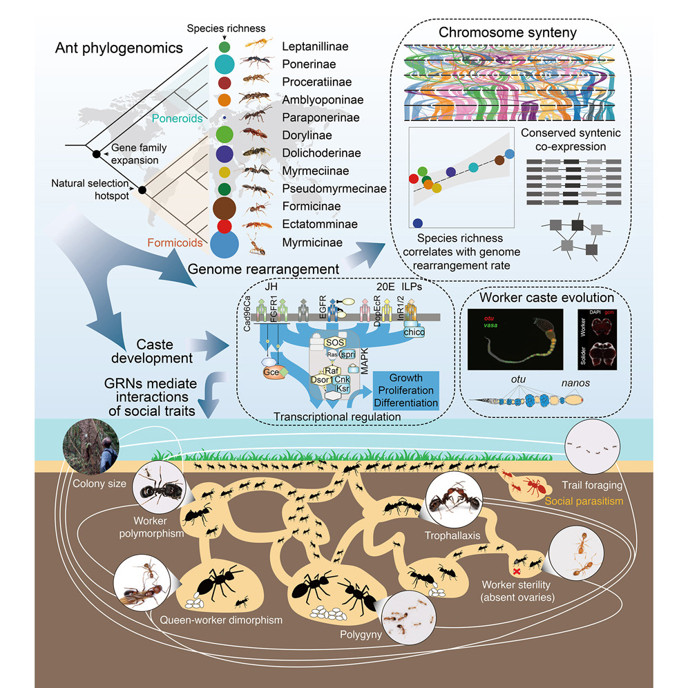 该研究通过整合分析全球163种蚂蚁的全基因组数据(其中145种为首次测序)发现:蚂蚁基因组经历了大规模重排,并与物种形成速率密切相关。同时,保守的共线性区块中富集了参与基础代谢和品级分化的共表达基因网络。在蚂蚁祖先中,与消化、内分泌信号、表皮碳氢化合物合成和化学感受相关的基因家族显著扩张;而与品级分化相关的基因在正蚁类(Formicoid)祖先中出现了显著的正选择信号。此外,研究还发现,蚂蚁社会性状的演化受三条高度保守的信号通路——保幼激素(JH)、MAPK和胰岛素通路的调控。研究团队进一步通过功能实验验证了MAPK通路在调控蚂蚁品级分化中的关键作用。该成果首次从基因组层面重建了社会性状的遗传基础,并揭示了其在基因调控网络中的整合机制,为理解超级有机体的演化提供了重要线索(图2)。