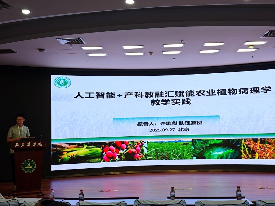 本次研讨会以“创新融合与发展,赋能新农科人才培养”为主题,聚焦植物病理学教学理念革新与教学方式升级等关键议题。会上威尼斯官网许雄彪老师以“人工智能+产科教融汇赋能农业植物病理学教学实践”为题作专题报告,系统介绍了威尼斯官网近年来在农业植物病理学课程改革方面的探索举措与实践成效,获得与会专家的广泛关注和高度评价。