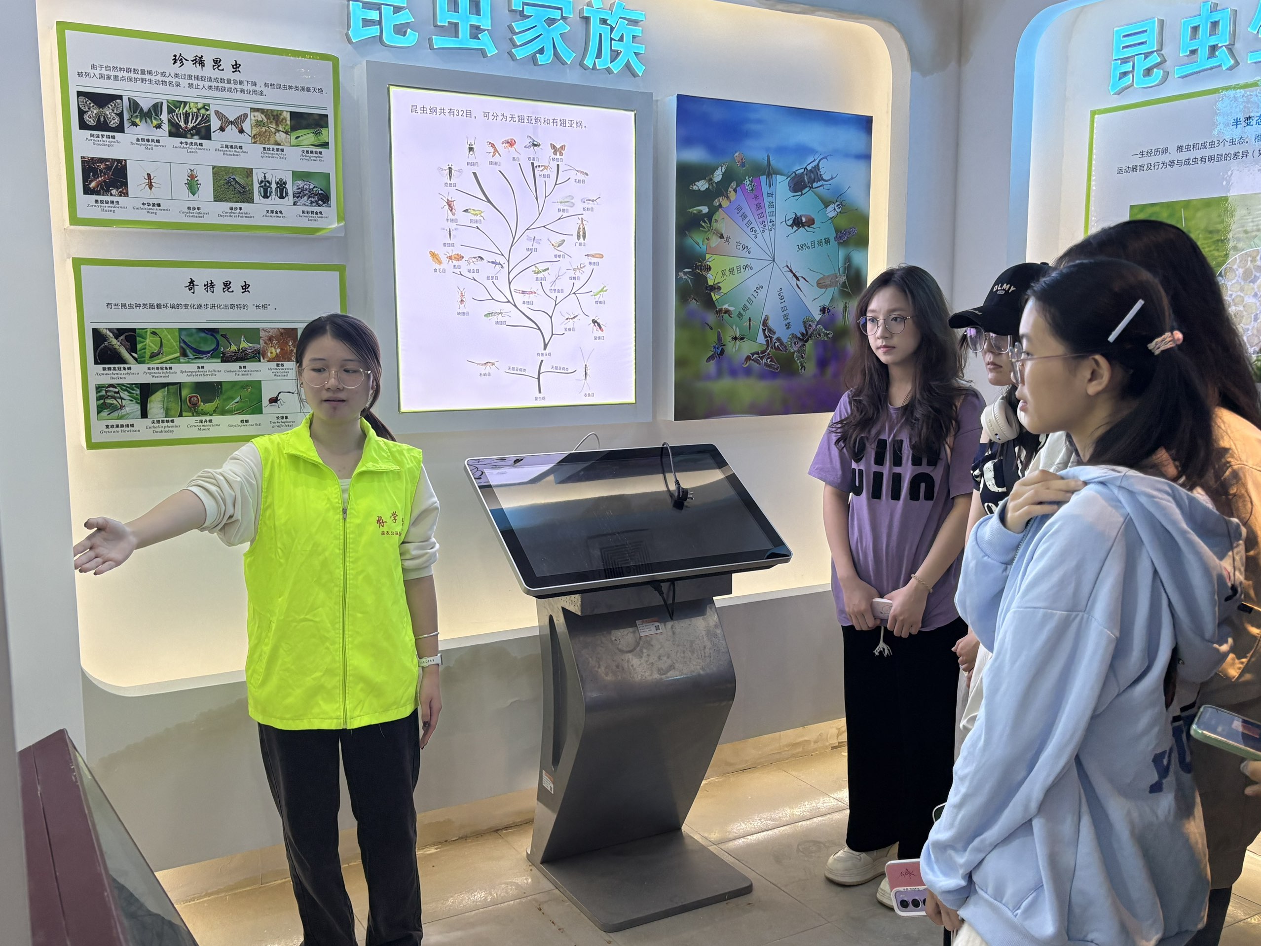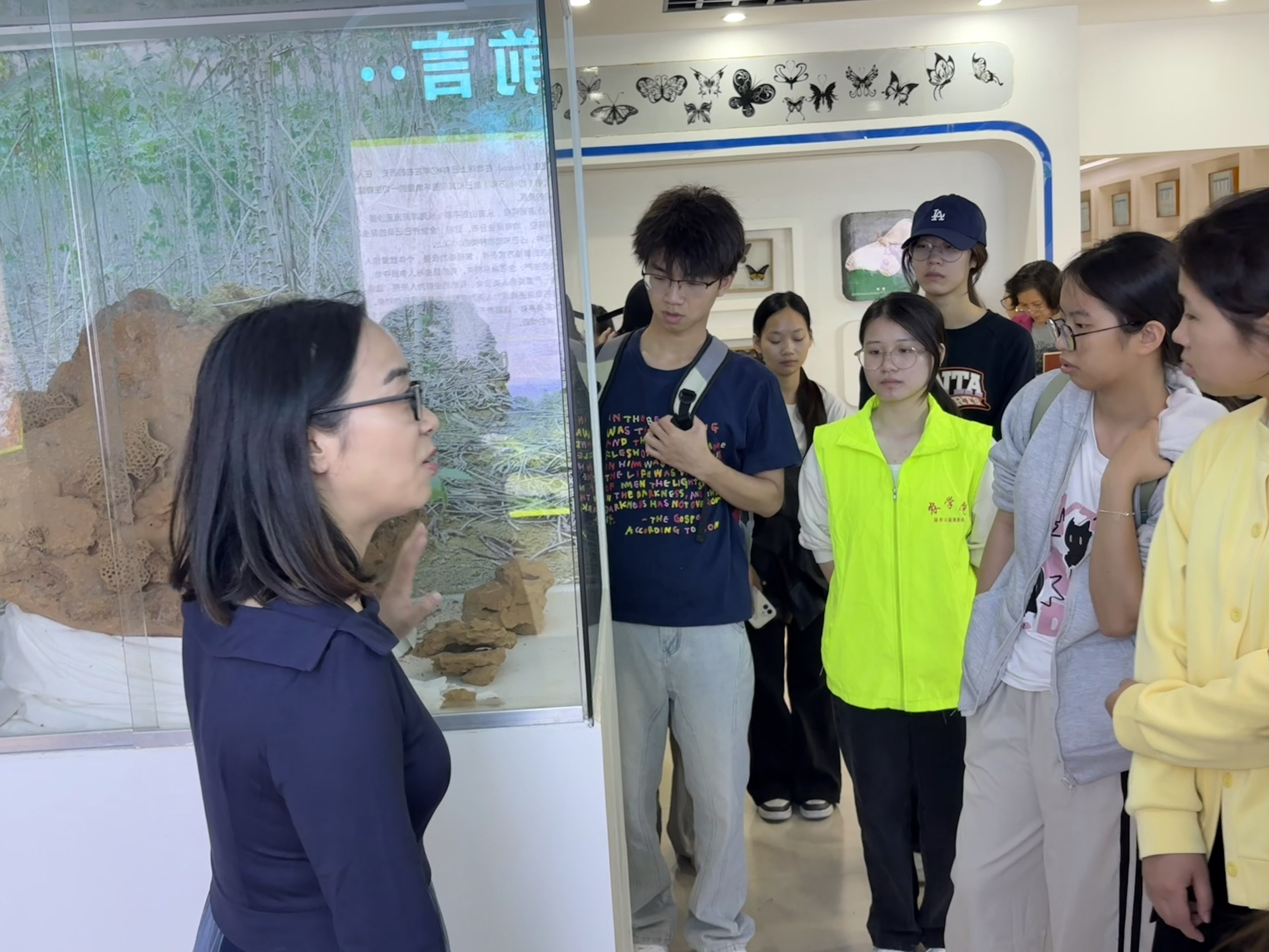 在昆虫展厅内,丰富的标本收藏、系统的进化脉络展示与生动的生态环境模拟,为讲解员们呈现了一场直观的博物学课堂。同学们细致观察各类昆虫的形态特征,认真研读科学解说,并就昆虫分类、行为习性及生态价值等问题与展厅专业人员进行了深入探讨。自然科学领域的具象知识,有效弥补了同学们在人文社科知识结构之外的认知空白,为日后在图书馆开展跨学科科普服务积累了宝贵素材。