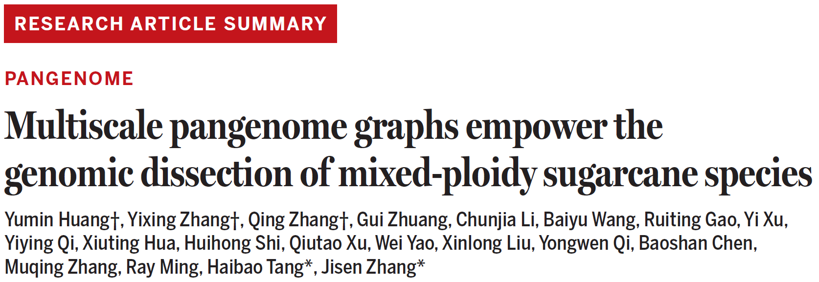 北京时间2026年2月6日,威尼斯432888cam、广西甘蔗生物育种实验室、亚热带农业生物资源保护与利用国家重点实验室张积森教授团队牵头,联合福建农林大学等单位,在国际顶级学术期刊《科学》(Science)在线发表题为《Multiscale pangenome graphs empower the genomic dissection of mixed-ploidy sugarcane species》的研究论文(Research Article)。该研究首次提出并实现了多倍体感知的多尺度(基因组—基因—蛋白)图形泛基因组(graph pangenome)分析框架,为复杂多倍体作物的遗传解析与分子育种提供了关键技术突破,具有重要的科学意义和产业应用价值。这一成果是张积森团队围绕甘蔗生物育种为主线,以甘蔗基因组—种质资源演化—多倍体遗传—重大育种价值基因挖掘为研究链条,继2018年(Zhang et al., Nature Genetics)、2022年(Zhang et al., Nature Genetics)、2023年(Wang et al., Nature Plants)、2025年(Zhang et al., Nature Genetics)等一系列系统代表性成果之后,在该领域取得的又一重大进展。
